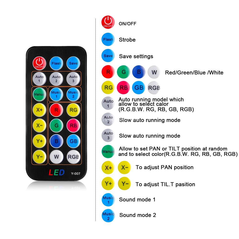 - Installation design: easy to install, easy to adjust the light angle Special remote control effect: with 3 automatic, 2 sound modes and strobe mode, single color or mixed colors (R/G/B/W/RG/RB/GB/RGB) Can be fixed, pull out multiple color effects and fix X and Y